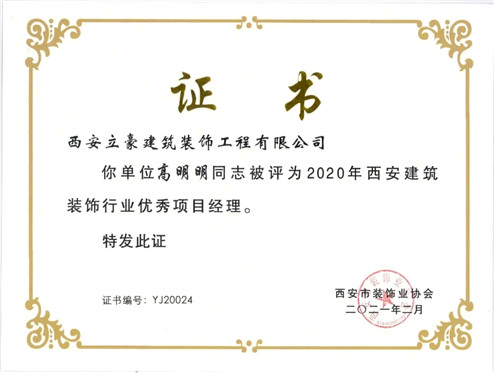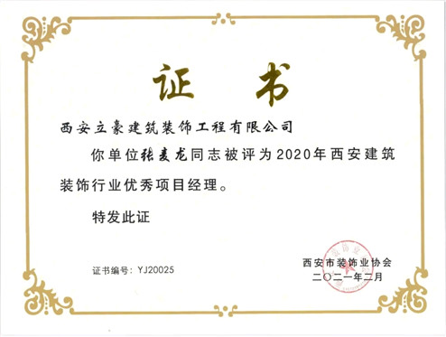 我公司資深項目經(jīng)理桂志平、高明明、張麥龍被評為2020年西安建筑裝飾行業(yè)優(yōu)秀項目經(jīng)理。